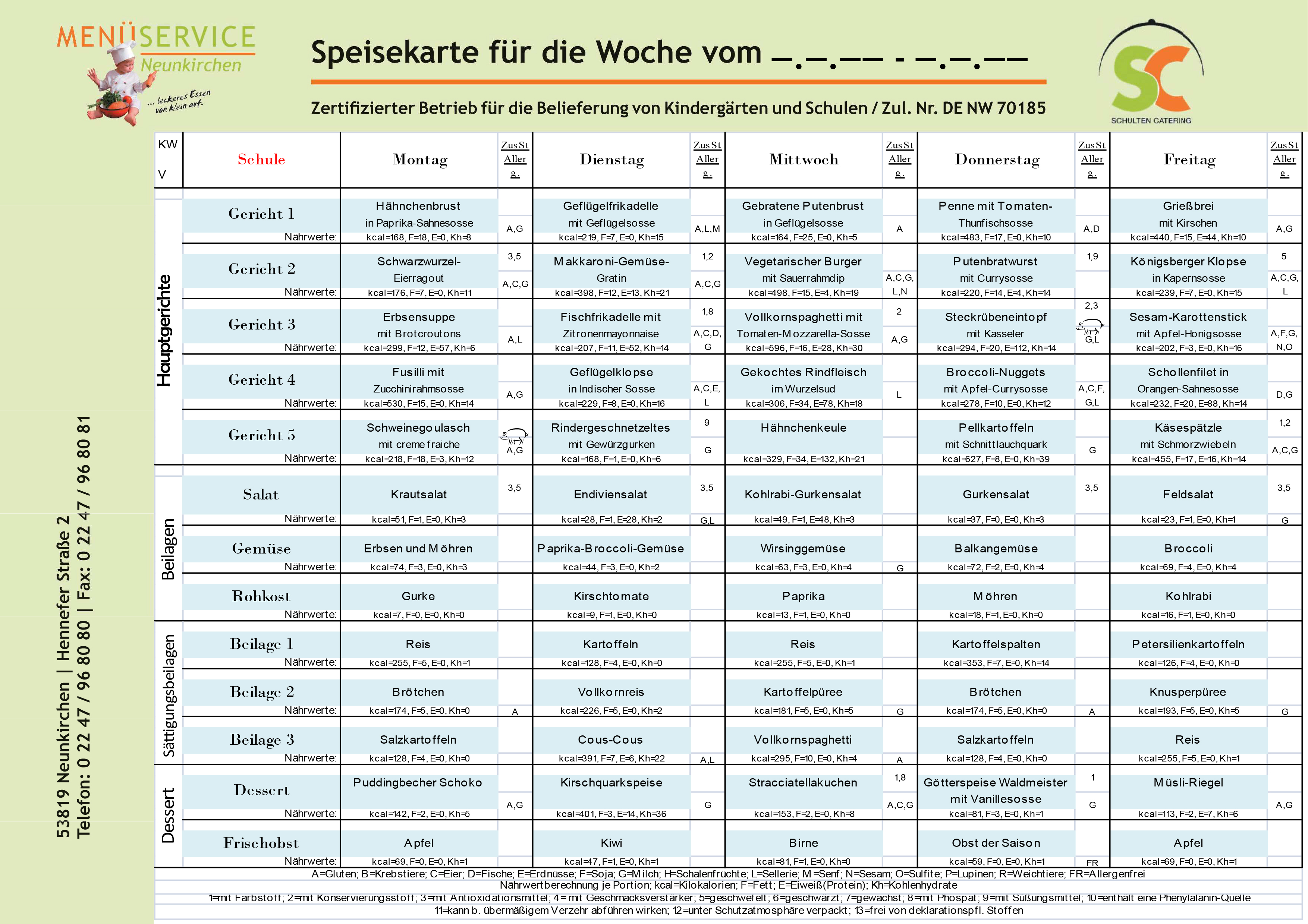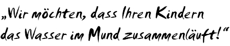 Kinder und Jugendliche haben bei uns tagtäglich die Qual der Wahl. Aus fünf Hauptgerichten, drei Beilagen (Salat, Gemüse, Rohkost), drei Sättigungsbeilagen (inklusive Vollwert) und zwei Dessertangeboten bauen sie sich ihr tägliches Lieblingsessen. Frei nach unserem Leitspruch: „leckeres Essen von klein auf.“ Essenbestellungen sind montags bis freitags von 7.30-14.30 Uhr möglich.