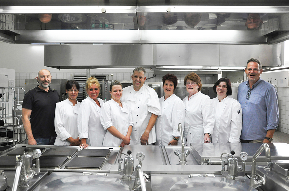Firmeninhaber Rolf Wetzels (rechts) sorgt mit seinem Küchenteam und Kooperationspartner Georg Schulten (links) dafür, dass es allen Kunden schmeckt - "von klein auf ...".